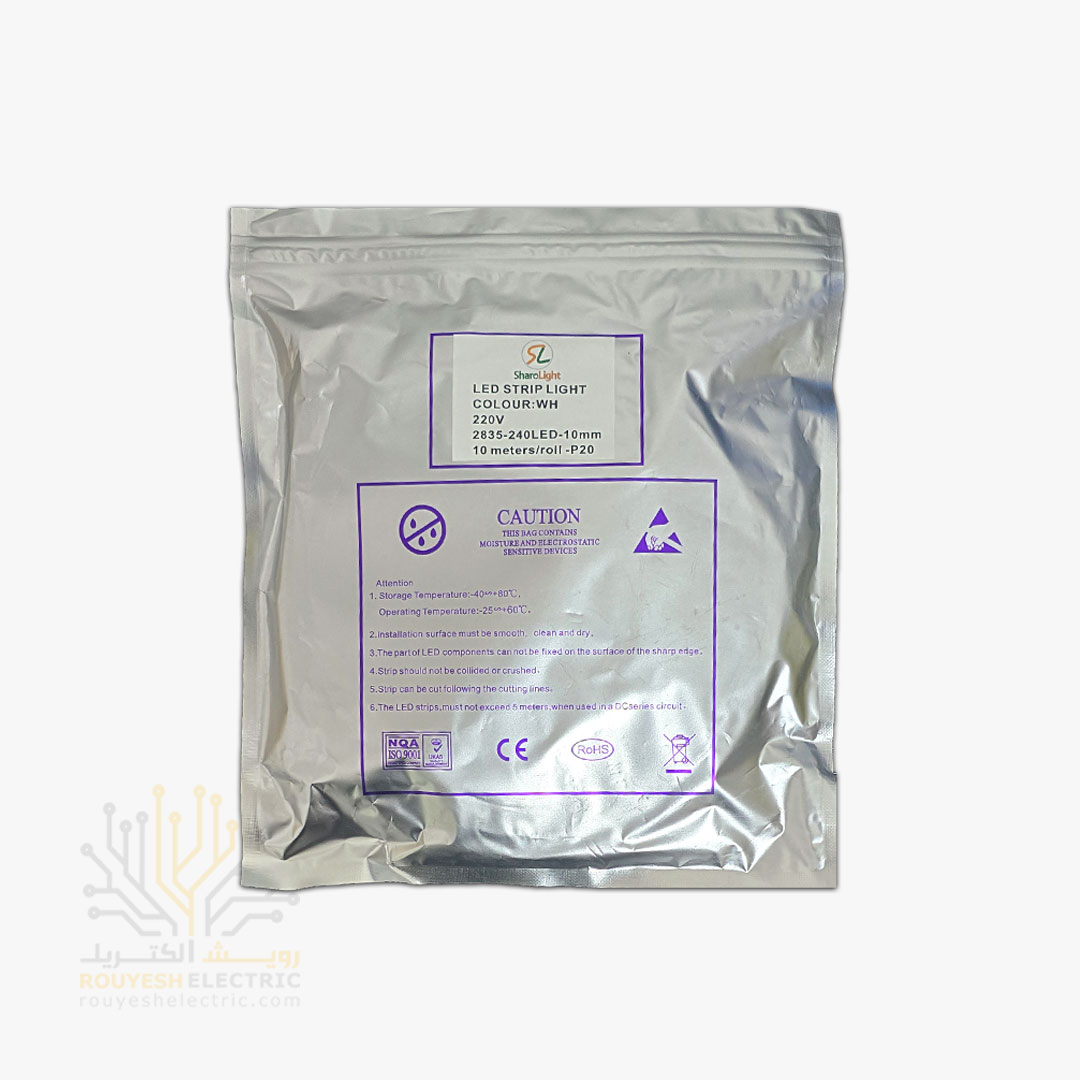 ریسه نواری لاینر 220 ولت برند شارو لایت تراکم 240 برش 10 سانت 1 میل نچرال مخصوص فضای مرطوب حلقه 50 متر