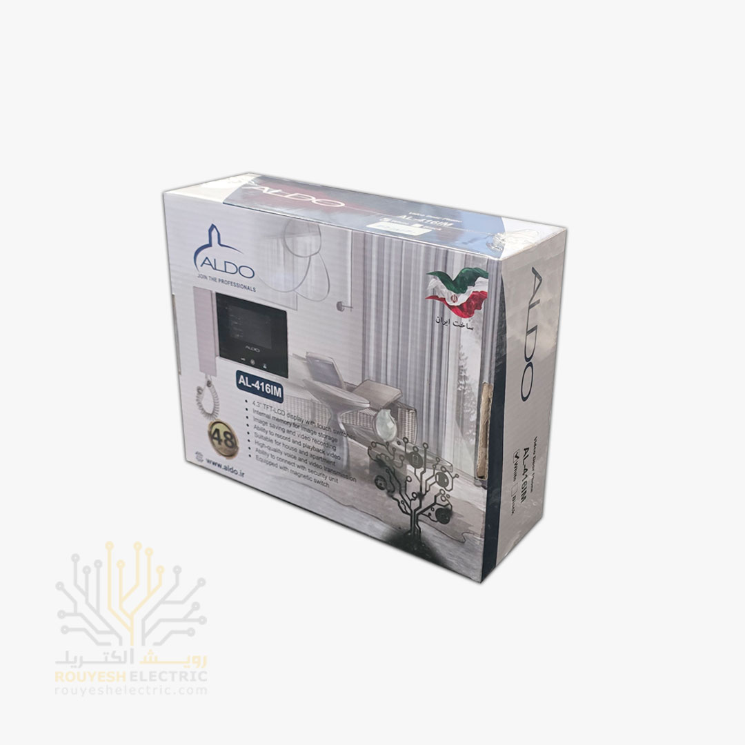 مانیتور 4.3 اینچ برند الدو مدل 416m با حافظه سفید موجود در شرکت ما تولید کشور ایران می باشد.از مزایای این محصول می شود به تنوع قابلیت های مختلف در پنل ها، مانیتور با سایز نمایشگر 4 اینچی، قابلیت ثبت تصویر و ضبط فیلم چند ثانیه ای از شخص زنگ زننده و همچنین ضمانت تعویض یکساله آن اشاره کرد؛ ضمنا 2 سال ضمانت تعویض برد معیوب (جمعا 3 سال ضمانت ) از دیگر مزایای این مدل پنل آیفون تصویری می باشد.