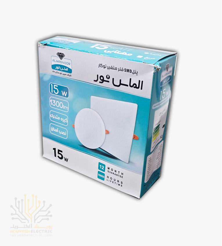 این پنل LED توکار با توان ۱۵ وات و طراحی مربعی استاندارد، از سری محصولات فول لایت برند الماس نور است. نور مهتابی (سفید سرد) آن، روشنایی شفاف و یکنواختی را فراهم میکند و برای فضاهای داخلی مانند منازل، دفاتر، فروشگاهها، راهروها و محیطهای کاری بسیار مناسب است. طراحی با فنر متغیر، امکان نصب در برشهای مختلف سقف را فراهم میکند و نصب آن را بسیار آسان میسازد.