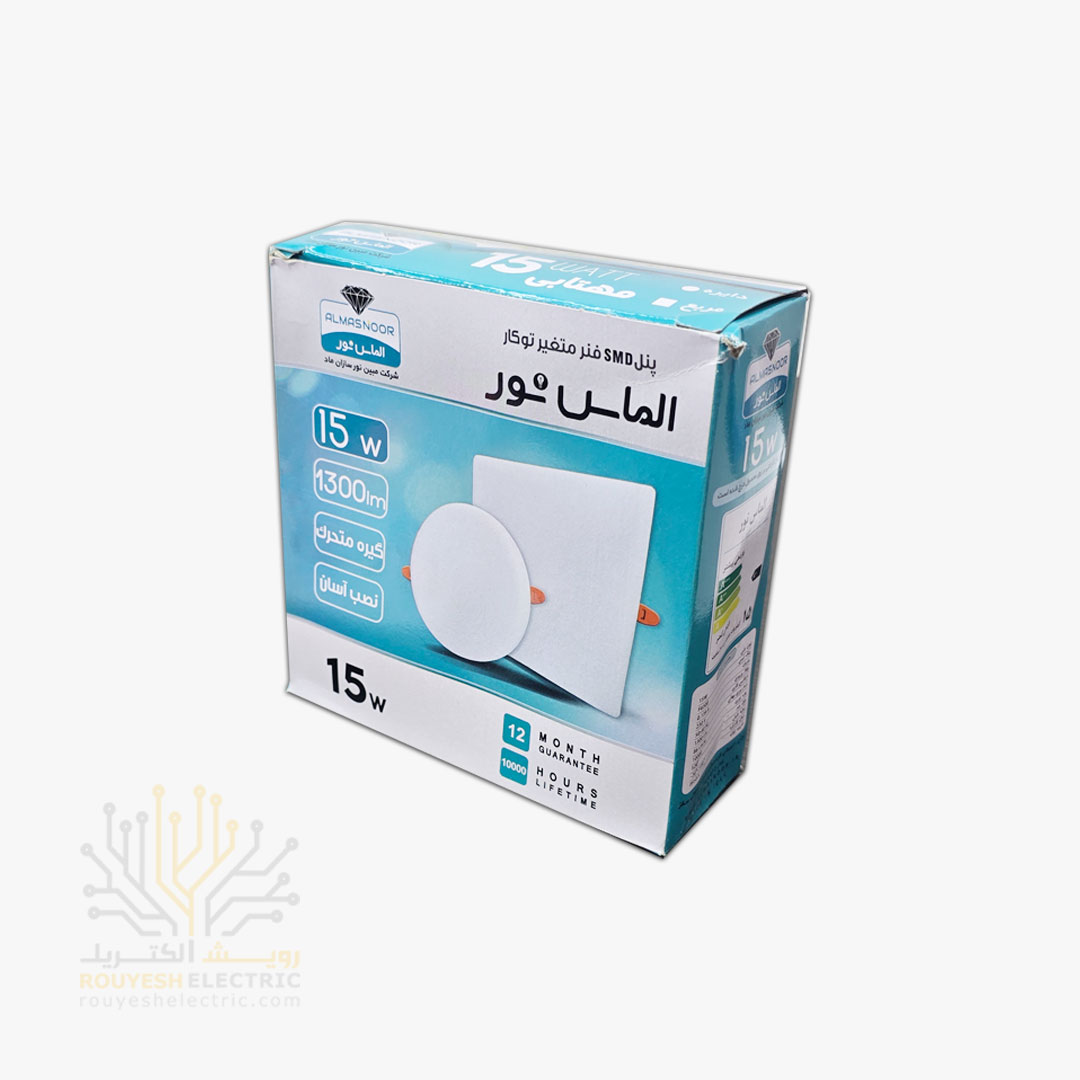 پنل سقفی توکار 15 وات برند الماس نور مدل فول لایت فنر متغیر مربع استاندارد مهتابی