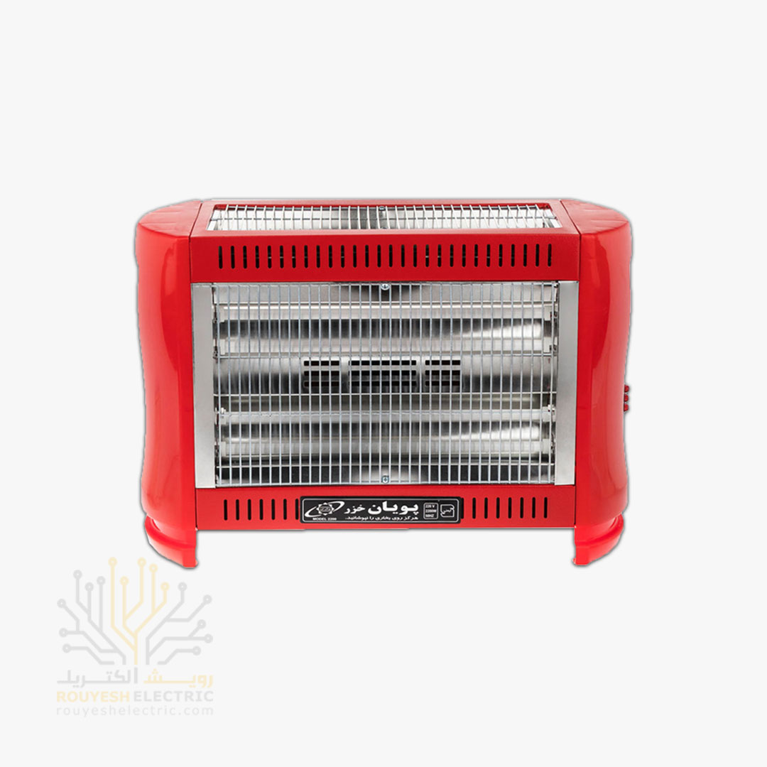 بخاری برقی فن دار برند پویان خزر مدل 2200 المنت شیشه ای 2200 وات پنج شعله استاندارد