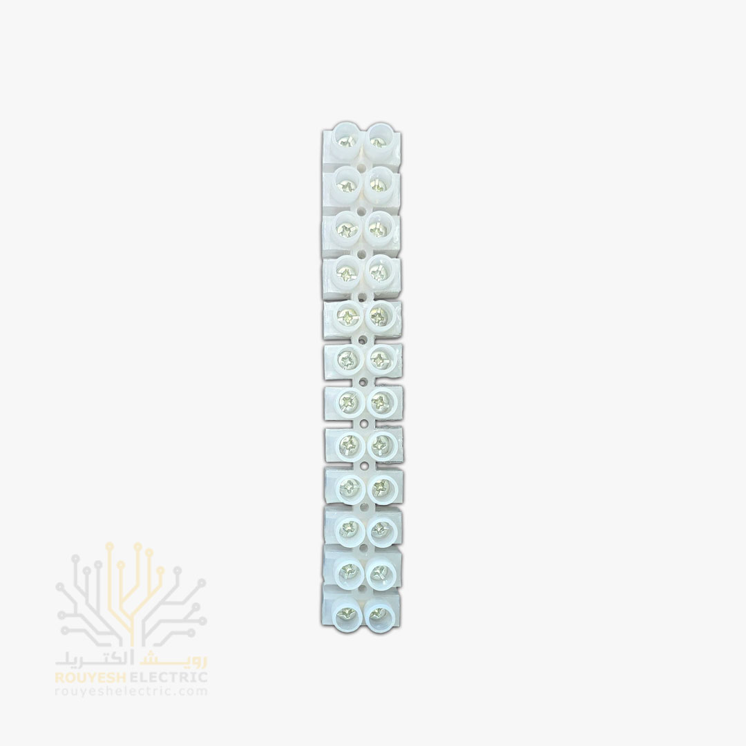 این ترمینال شکل مستطیلی داره و ظاهرش جمعوجور و خوشدسته. طولش حدود ۱۴.۵ سانته، عرضش ۲.۲ و ارتفاعش حدود ۲ سانت، یعنی نه خیلی بزرگه نه دستوپاگیر. بدنه از پلیاتیلن ساخته شده و چون بیرنگ و شفافه، داخلش و محل اتصال سیمها رو راحت میتونی ببینی. هر بسته شامل ۱۰ شاخهست که توی یه جعبه مقوایی مرتب بستهبندی شدن و هر کارتن هم ۲۰۰ بسته داره. کمترین مقدار سفارش ۱۰ شاخهست. این مدل ۱۲ تا سیمگیر داره که باعث میشه بتونی چند تا سیم رو خیلی مرتب و مطمئن به هم وصل کنی.