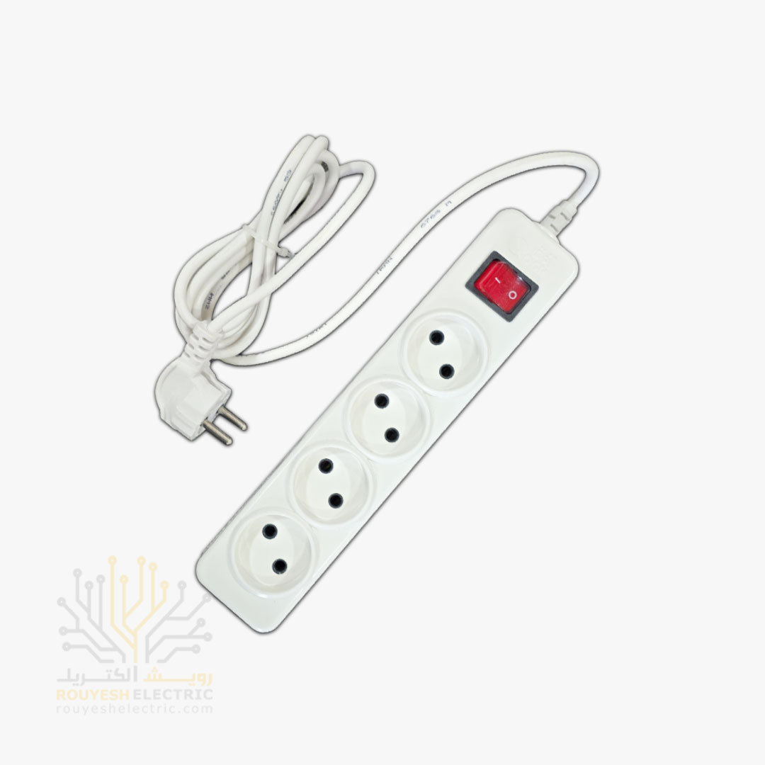 این چندراهی برق، چهار ورودی داره که می‌تونی وسایل مختلف رو بهش وصل کنی و یه کلید داره که روشن و خاموش کردنش رو راحت می‌کنه.