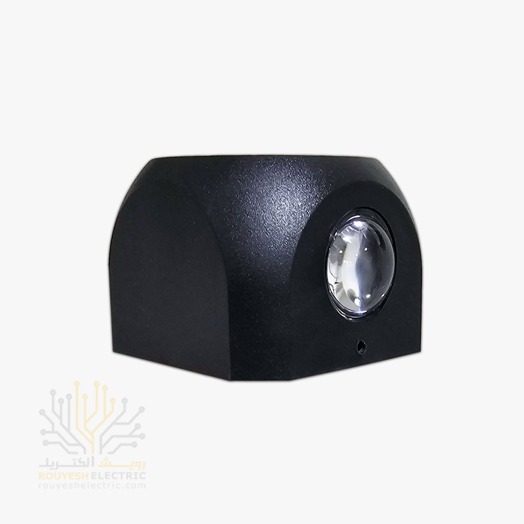 چراغ دیواری دکوراتیو 6 وات برند ایران مهر مدل کلبه ای دو طرفه کد ایران 50 بدنه مشکی نور آفتابی 6 ماه گارانتی