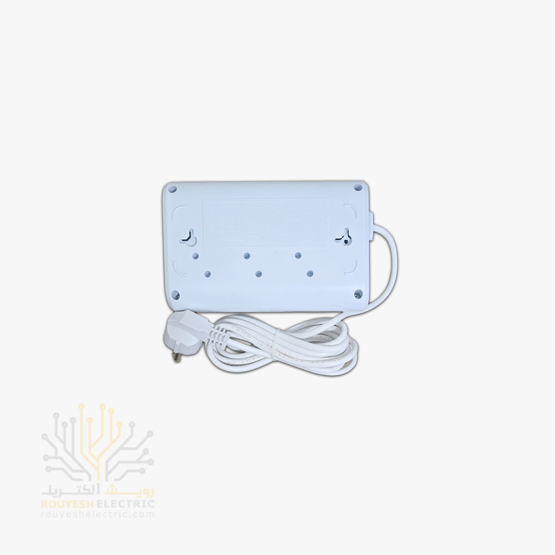 محافظ برق کامپیوتر سیار پنج خانه برند فروزش مدل FR250 بدون ارت کلید دار بدنه سفید آنالوگ 1/8 متری