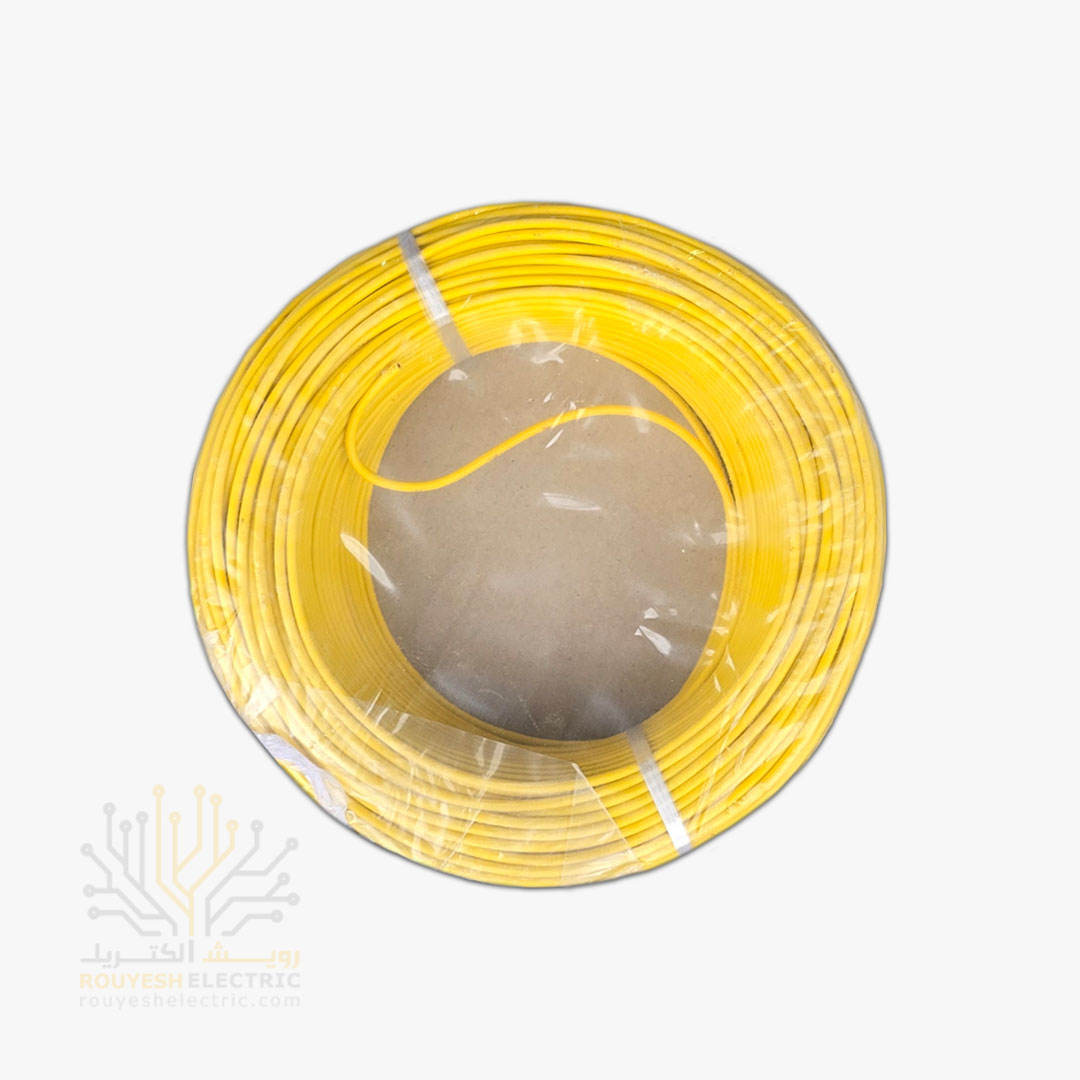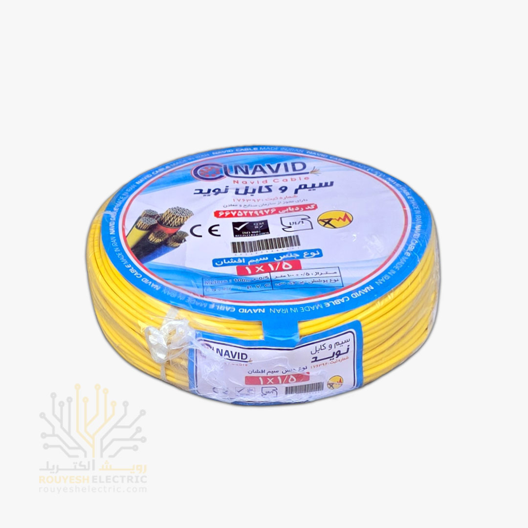 سیم برق نمره 1x1/5 برند نوید استاندارد رنگ زرد حلقه 100 متری