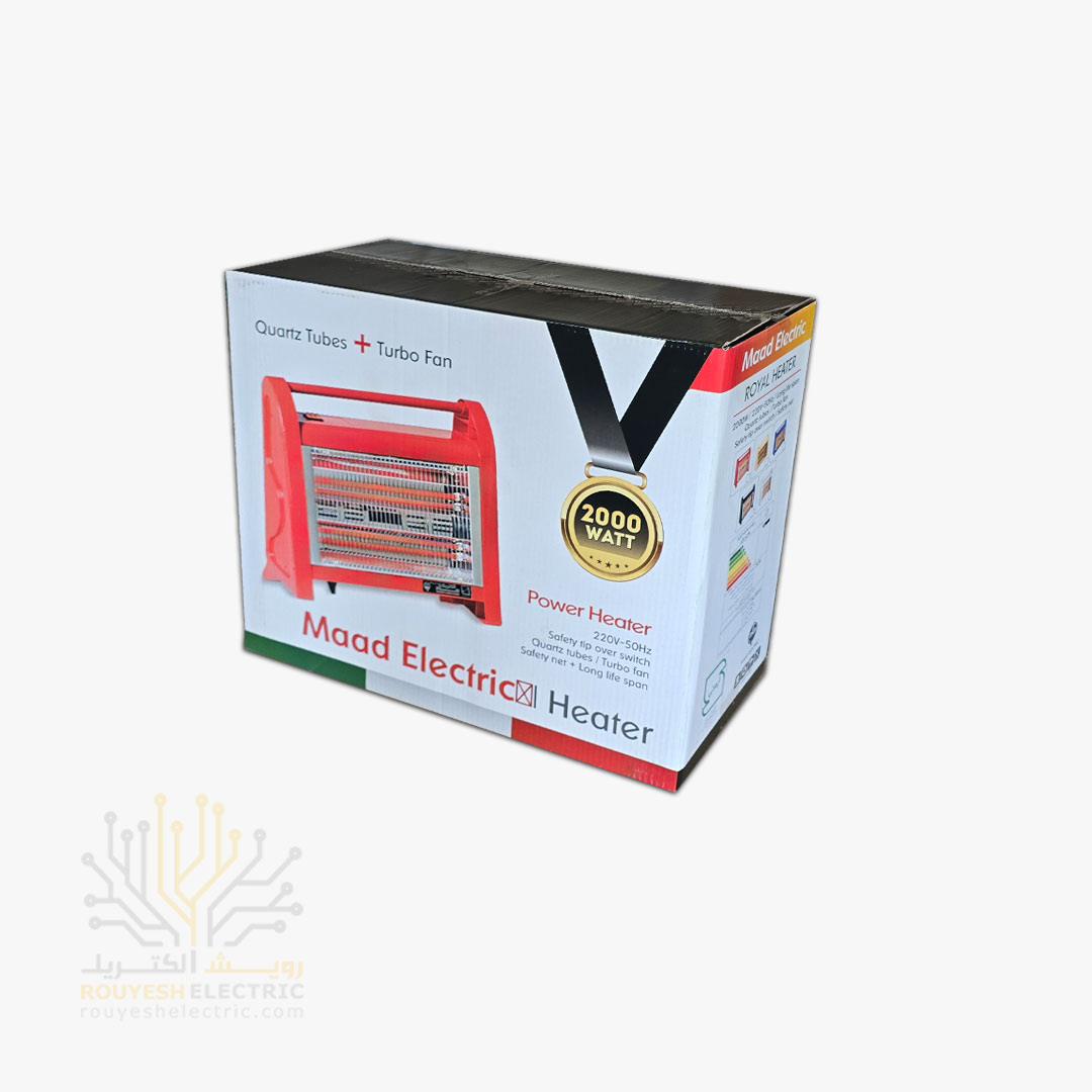 بخاری برقی استاندارد برند ماد الکتریک مدل رویال 4 شعله 2000 وات فن دار بدنه قرمز