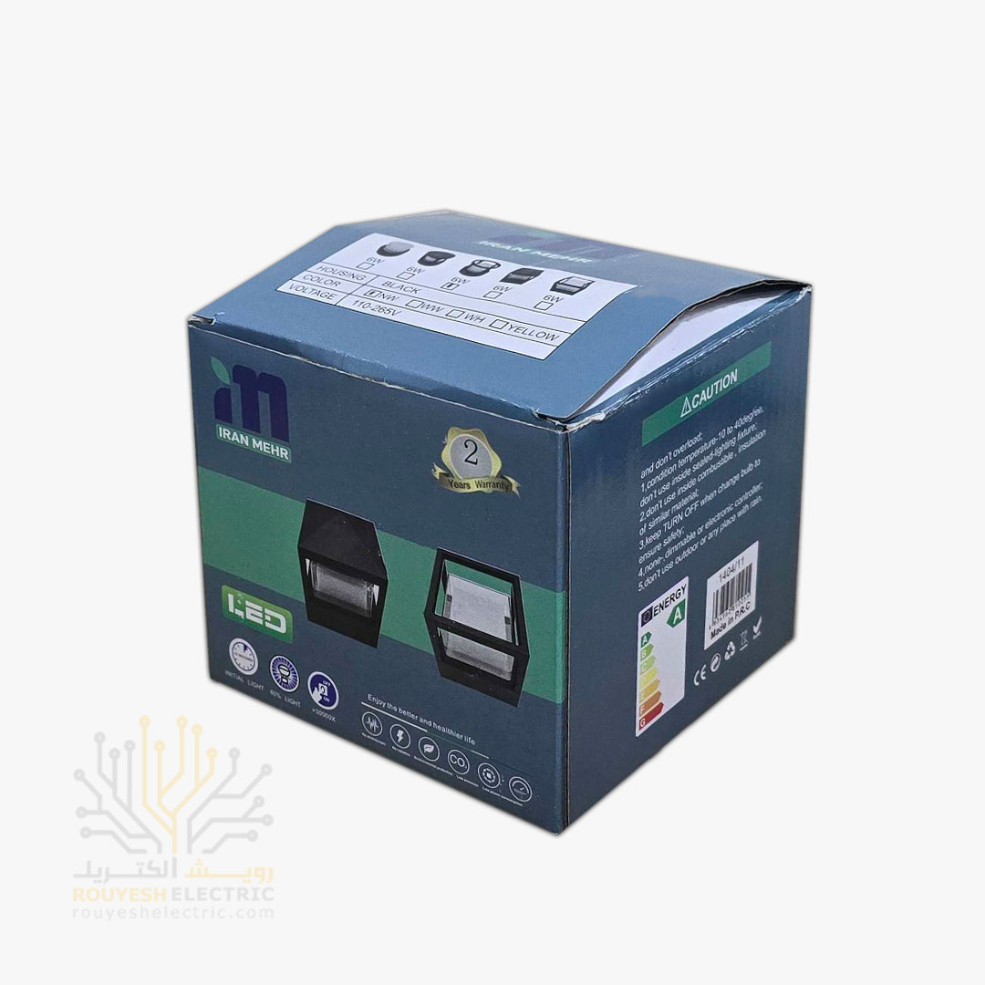 چراغ دیواری دکوراتیو 6 وات برند ایران مهر مدل مکعب یک طرفه کد ایران 21 بدنه مشکی نور نچرال